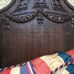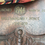Right: photo of the bottle used in christening the Mississinewa in 1944. The photo shows the plaque presented to Margaret for her role in christening the Mississinewa. Photo taken 6 August 2017, courtesy of Margaret's daughter, Ruth Howell, who found the plaque amongst her mother's things.